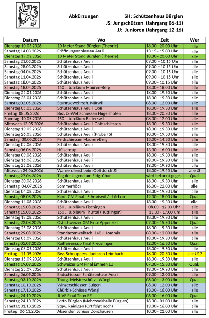 Das Obligatorische schiessen findet immer im Schützenhaus Aeuli Bürglen statt.